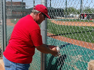 Yours truly trying to get a ball up the fence and over the top. It was trapped between the roll of tarp and the fence. I was able to handle it up and some little girl scaled the fence at the top, reached over and grabbed it, and she kept it. Hmmm!