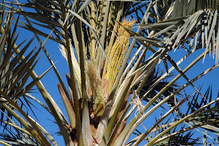 Above, he is attempting to show us the female pod that is about to "bloom", at which time it will be ready to receive the male pollen. Below is the female pods. The bag he is holding will be placed around the entire pod after pollenating. The bag protects the pod from birds, insects and rodents. It also protects the dates when near-ripe from the sand/dust as they become very sticky.