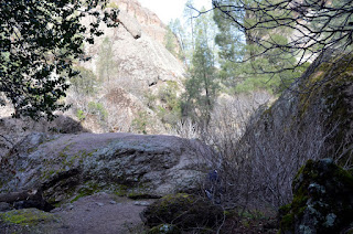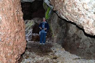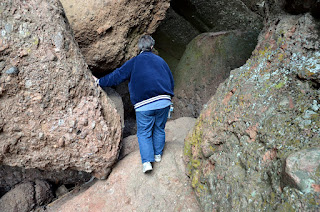 Above is from the parking lot of the west pinnacles. Below, Nancy wedging her way thru the boulders.