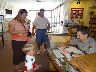 Austin, recieving instructions on his Junior Ranger challenge for the hike, and signing his name to the form. Ranger was surprised that he could spell and write his name. We weren't. Bright boy, just like his Pop Pop. :-)