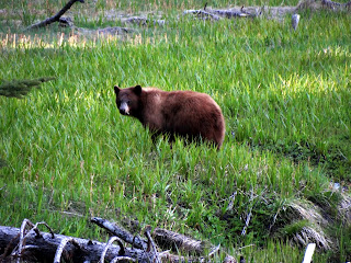 OK, back down to earth...this is more like it...terra firma! And below is most "firma", a cinamon black bear enjoying an evening in the lettuce patch.
