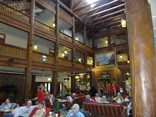 Above, tiny Wild Goose Island, and below a ranger program underway describing the Many Glacier Hotel and the surrounding landscapes. Picswere taken on the back deck of the hotel great room. We lunched here.