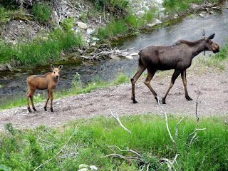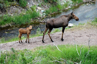 Just to the east of the hotel about a mile, we came upon Momma Moose and her baby, and Momma Grizzly and her three cubs. Her three cubs included two from last year and one very small light tan cub from the past spring. Poor little fella had a hard time moving in the tall grass. I'm not sure if we even got a good pic of the little fella.